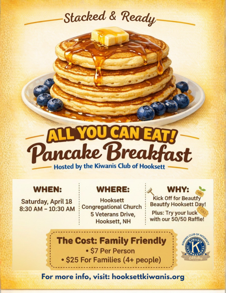 Our 2026 pancake breakfast will take place on Saturday April 18, 2026 at the Hooksett Congregational Church. Please see the details below.