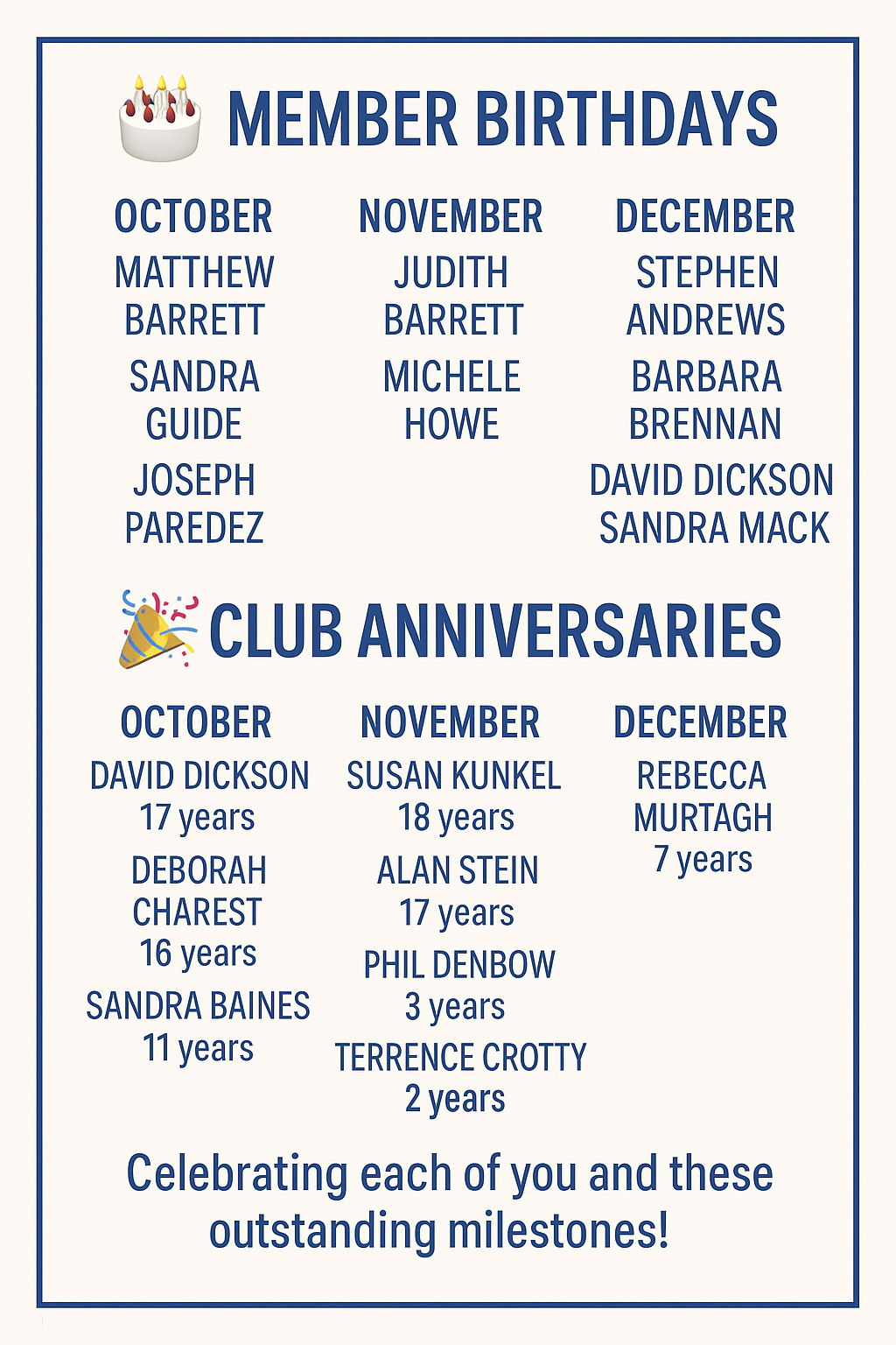 Keep an eye out for upcoming newsletters in December, February, June, and September for updates, club highlights, and opportunities to get involved.