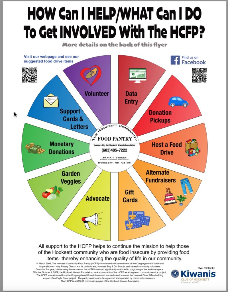 The Hooksett Kiwanis Community Food Pantry provides essential support for local families in need. You can participate by donating food, volunteering, or contributing funds—every contribution strengthens our community. For the months of November/December, you can donate any Thanksgiving/Christmas related food items (stuffing, boxed potatoes, cranberry sauce, etc.). For the month of January: canned soup is always welcomed. Check out the information below for all the ways to help…